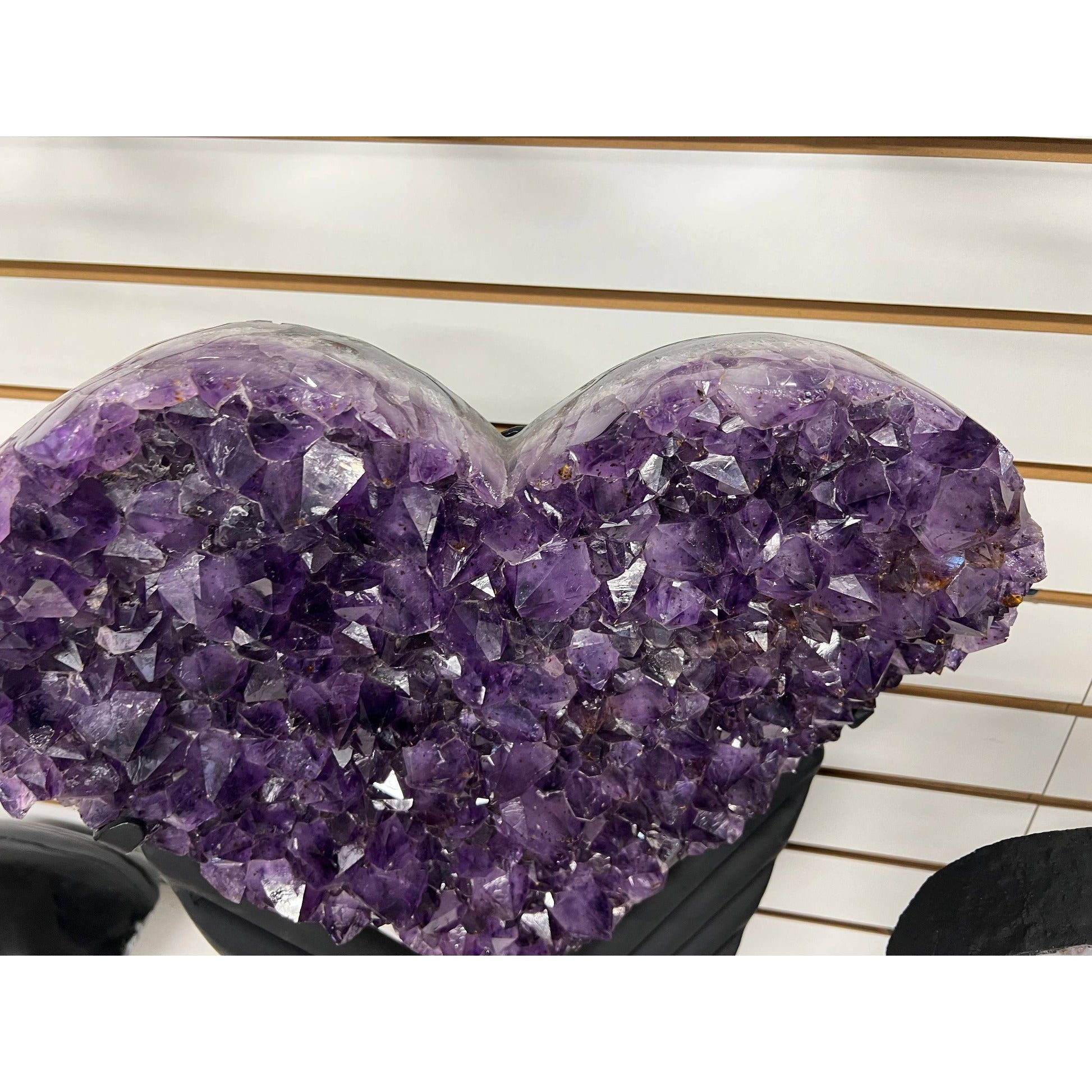 Amethyst heart with stand — a museum-quality amethyst crystal cluster hand-carved into a heart shape and mounted on a custom black stand. At 43 lb, this is a substantial display piece with deep violet color and densely packed natural crystal points across the entire surface.