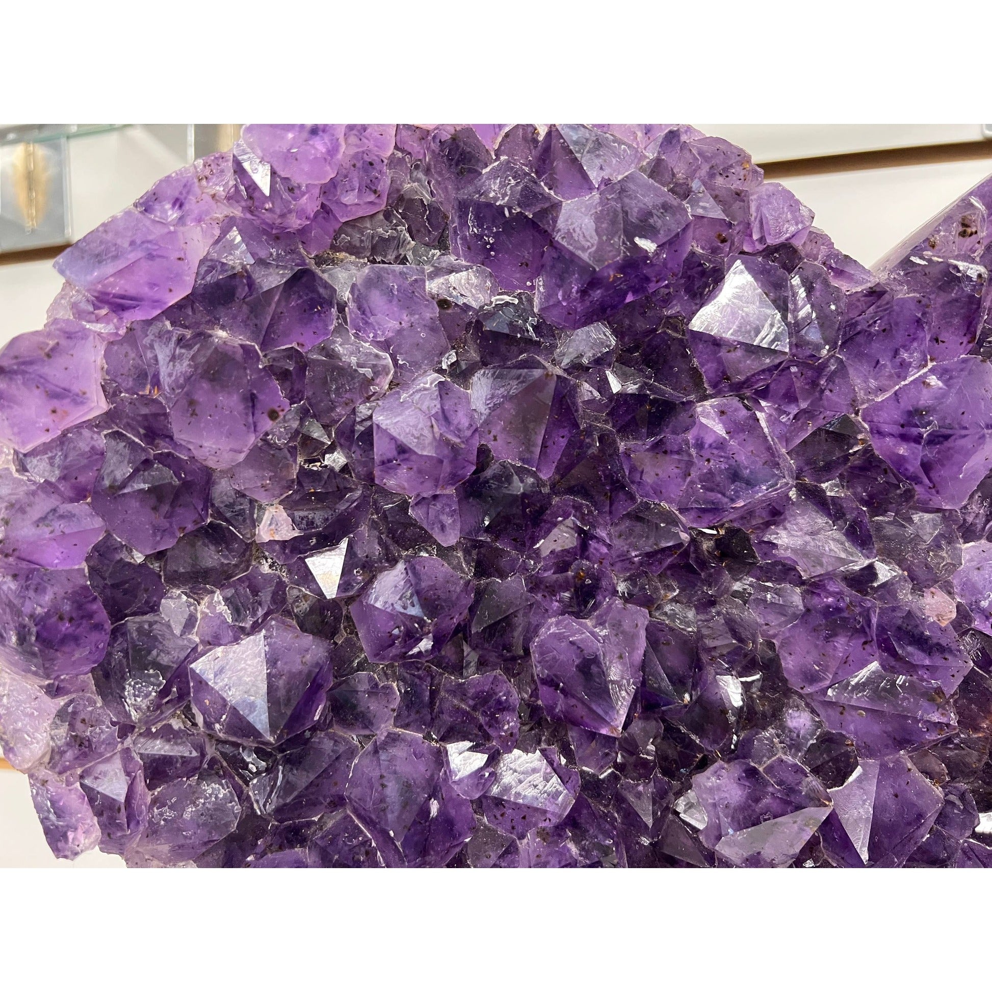 Amethyst is a variety of quartz (SiO₂) colored by iron and natural irradiation, forming in volcanic cavities across Brazil, Uruguay, and Zambia. The heart shape is hand-carved to follow the natural crystal base, preserving the raw druzy surface while giving the piece a striking sculptural form. Dense violet points with good clarity and natural luster throughout.